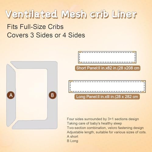 4 Sides Mesh Liner for Full-Size Cribs,Special Mesh Covers-Long Pieces (111in x 11in), Short Pieces(82in x11in) (White)